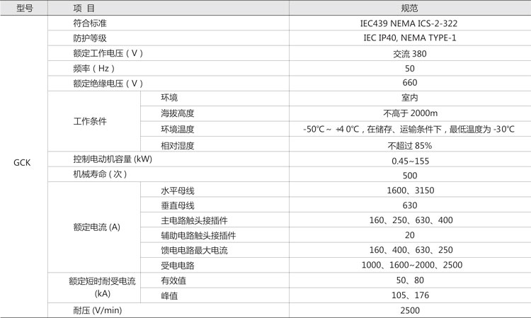 GCK低壓抽出式開關(guān)柜,主要是由一些組合式電動(dòng)機(jī)控制單元,和其它功能單元組合而成。這些單元以上下重疊的方式安裝在封閉的金屬柜體內(nèi)。用設(shè)置在柜體上方的水平母線,將每個(gè)柜體聯(lián)結(jié)在一起,同一柜體的功能單元?jiǎng)t并聯(lián)在垂直母線上。柜體共分水平母線區(qū)、垂直母線區(qū)、電纜區(qū)和設(shè)備安裝區(qū)等四個(gè)互相隔離區(qū)域,功能單元分別安裝在各自的小室內(nèi),當(dāng)任何一個(gè)功能單元發(fā)生事故時(shí),均不影響其它單元,防止事故擴(kuò)大。本產(chǎn)品符合JB/T9661-1999標(biāo)準(zhǔn)。該產(chǎn)品采用IEC114規(guī)定的IP40防護(hù)等級(jí),當(dāng)所有的門和護(hù)板關(guān)閉時(shí),或門開啟時(shí)以及功能單元外于移出位置時(shí),均能達(dá)到相應(yīng)的防護(hù)等級(jí),這樣可確保人身安全。該產(chǎn)品設(shè)置有完善可靠的接地系統(tǒng)和保護(hù)電路,所有功能單元均能按規(guī)定的性能要求,分?jǐn)喽搪冯娏鳎M(jìn)線單元具有三段保護(hù)特性。因此,可以保證供電的可靠性,和設(shè)備與系統(tǒng)的安全。所有功能單元,均可通過接口件與PC線板(可編程序控制器)或微處理機(jī)連結(jié),作為自動(dòng)控制系統(tǒng)的執(zhí)行單元,根據(jù)用戶需要還可以提供其它內(nèi)容的功能單元和功能組合,該產(chǎn)品適用于交流380V,頻率50Hz的電路中。